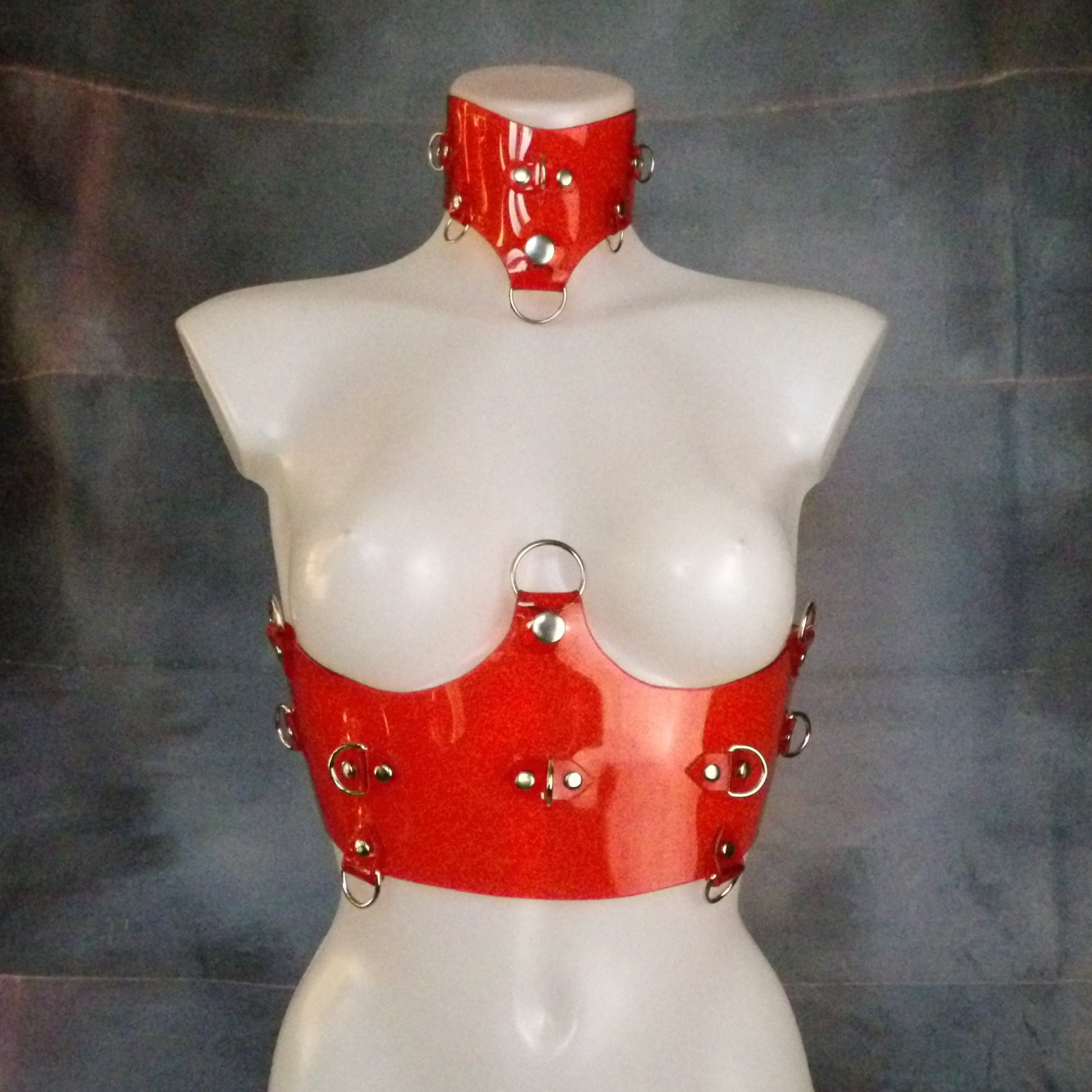 Thick, sturdy transparent red vinyl underbust corset belt with D-rings all around & a removable O-ring. It looks great as is or you can clip chains & other adornments to its ample anchor points.