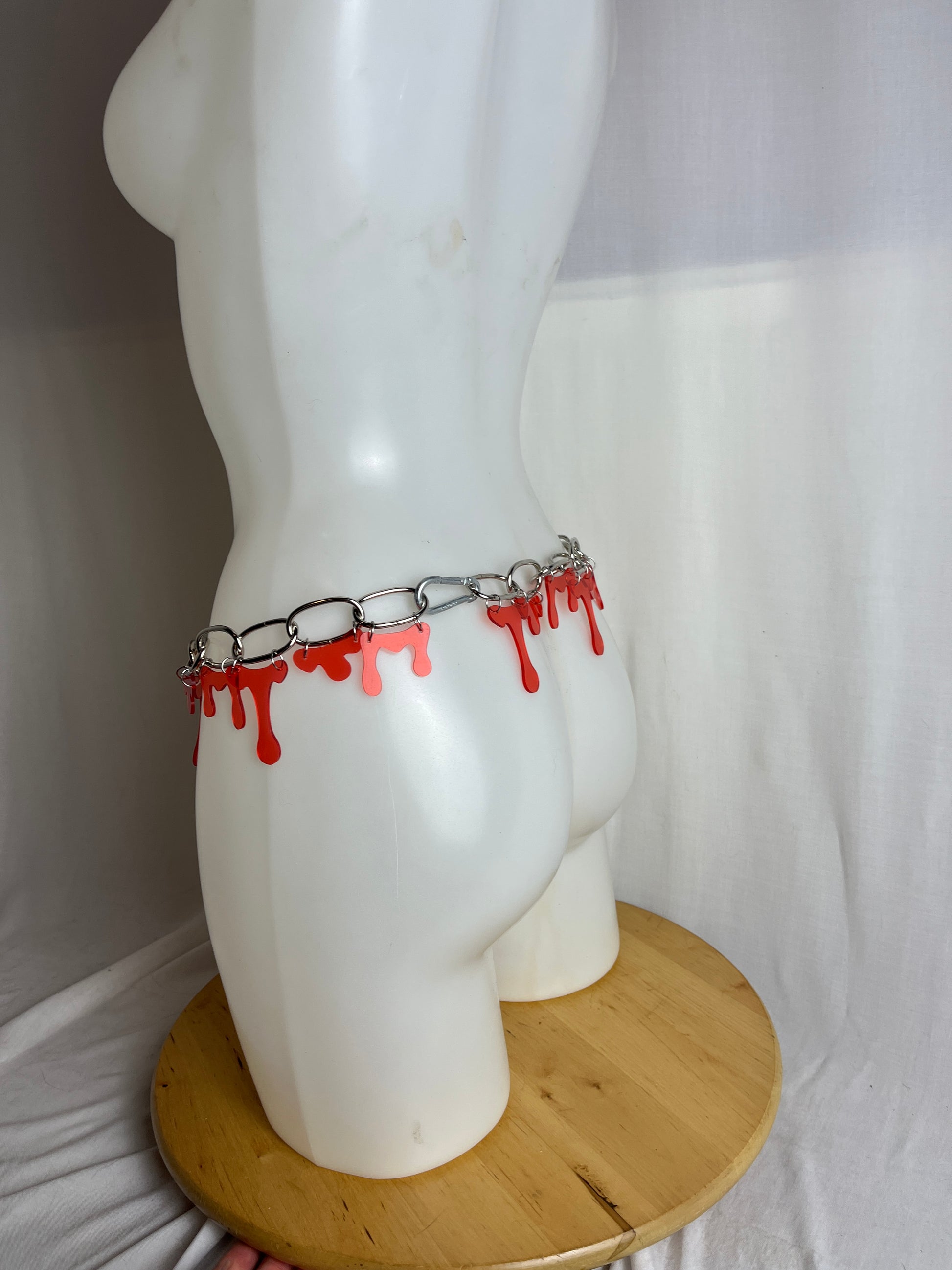 Heavy duty lamp chain & 40kg certified carabiner as fastener. Individually attached blood drips made from 2mm thick transparent red vinyl.